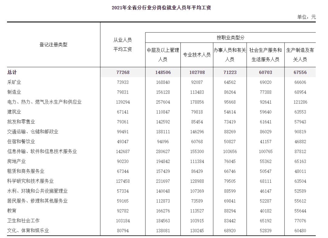 中層及以上管理人員148506元,增長8.8%;專業(yè)技術人員102708元,增長9.4%;辦事人員和有關人員71223元,增長10.5%;社會生產(chǎn)服務和生活服務人員60703元,增長9.9%;生產(chǎn)制造及有關人員67556元,增長9.0%。