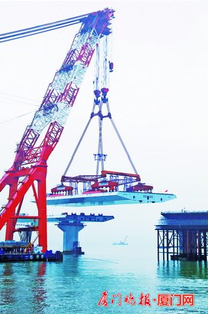 ■翔安大橋翔安側(cè)A3標(biāo)海中段最后一榀鋼箱梁正在吊裝。