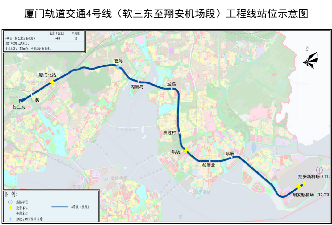 地鐵4號線(軟件園三期東至機場段)為島外環(huán)灣快線,起于后溪,途經集美區(qū)、同安區(qū)、翔安區(qū),止于翔安機場,線路全長約44.78千米,于2017年2月正式開工。