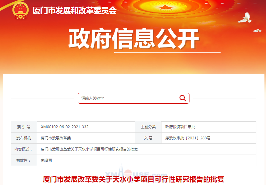 2021年11月,廈門市發(fā)展改革委發(fā)布關(guān)于天水小學(xué)項(xiàng)目可行性研究報告的批復(fù),同意建設(shè)天水小學(xué)項(xiàng)目。