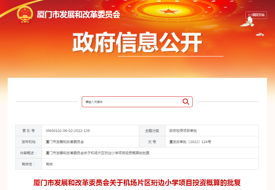剛剛,廈門(mén)市發(fā)展和改革委員會(huì)發(fā)布關(guān)于機(jī)場(chǎng)片區(qū)珩邊小學(xué)項(xiàng)目投資概算的批復(fù),同意批準(zhǔn)機(jī)場(chǎng)片區(qū)珩邊小學(xué)項(xiàng)目投資概算。