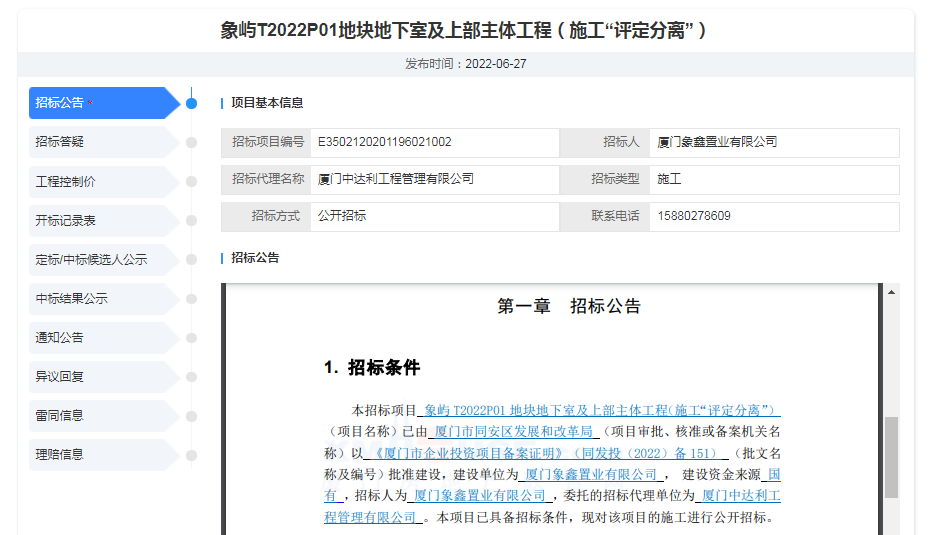 近日,象嶼T2022P01地塊地下室及上部主體工程(施工“評定分離”)招標公告發(fā)布。