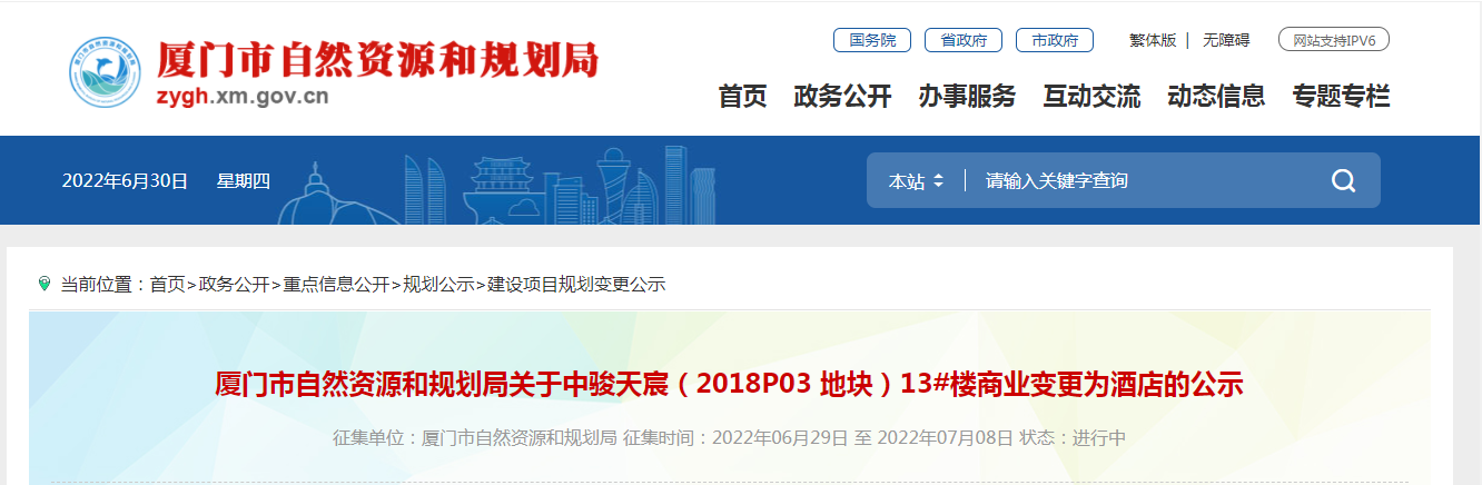 剛剛,廈門(mén)市自然資源和規(guī)劃局發(fā)布關(guān)于中駿天宸(2018P03 地塊)13#樓商業(yè)變更為酒店的公示。