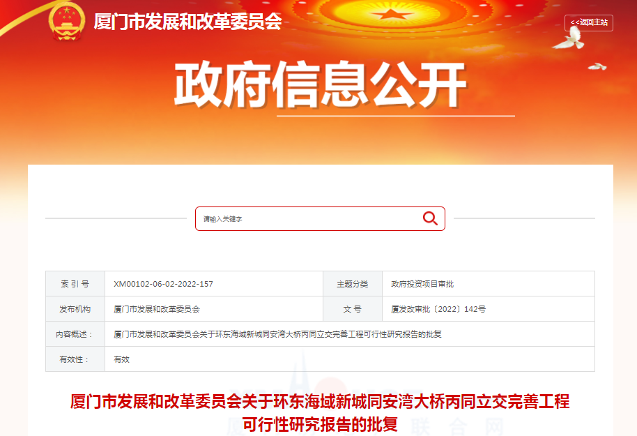 剛剛,廈門(mén)市發(fā)展和改革委員會(huì)發(fā)布關(guān)于環(huán)東海域新城同安灣大橋丙同立交完善工程可行性研究報(bào)告的批復(fù),同意建設(shè)環(huán)東海域新城同安灣大橋丙同立交完善工程。