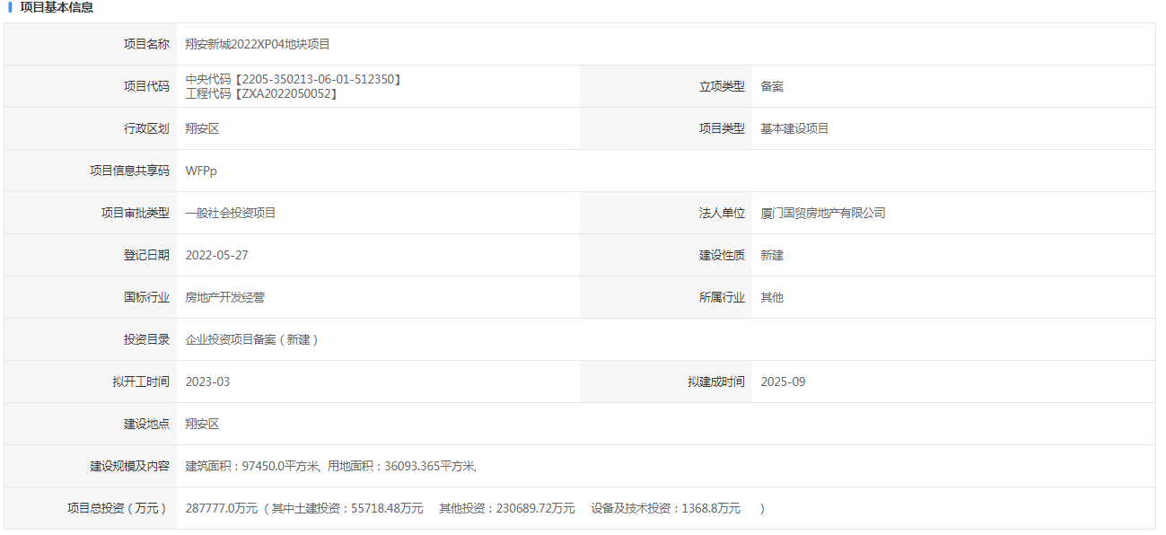5月底,翔安新城2022XP04地塊項目報建信息公布。項目建筑面積97450平方米,用地面積36093.365平方米,總投資約287777萬元,計劃明年3月開工,預(yù)計2025年9月建成。