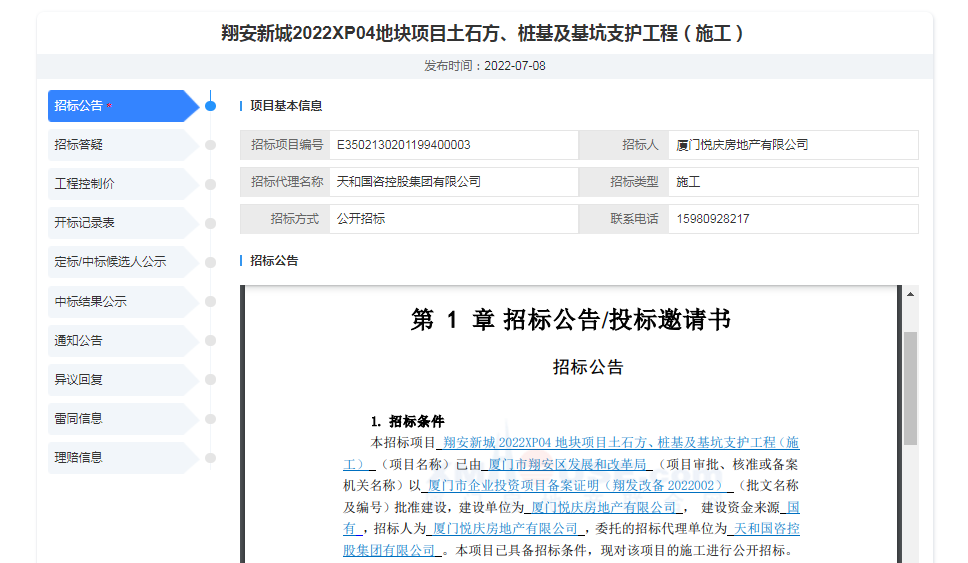 近日,翔安新城 2022XP04 地塊項目土石方、樁基及基坑支護工程(施工) 招標(biāo)公告發(fā)布。