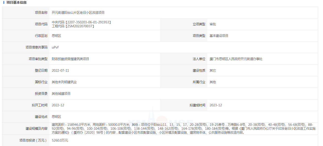 建筑面積158946平方米,用地面積50000平方米,項(xiàng)目位于陽(yáng)臺(tái)山11、13、15、17、20-28(雙號(hào))、19-25單號(hào),萬(wàn)壽路6-8號(hào)、20-38(雙號(hào))、40-48(雙號(hào))、56-68(雙號(hào))、88-92(雙號(hào))、94-96(雙號(hào))、100-104(雙號(hào))、106-108(雙號(hào))、138-144(雙號(hào))、148-162(雙號(hào))、164-178(雙號(hào))、180-184(雙號(hào))等。根據(jù)《廈門(mén)市人民政府辦公廳關(guān)于印發(fā)老舊小區(qū)改造工作實(shí)施方案的通知》(廈府辦〔2020〕98號(hào))的內(nèi)容,配套建設(shè)小區(qū)市政配套設(shè)施、小區(qū)環(huán)境及配套設(shè)施、建筑物本體、公共服務(wù)設(shè)施等改造內(nèi)容。