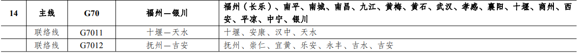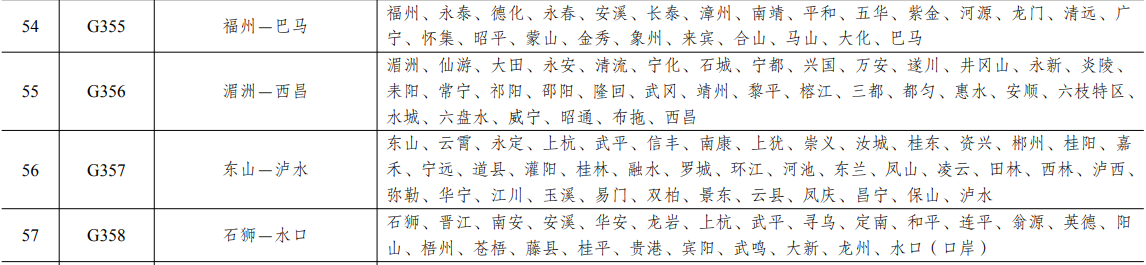 鶴崗—大連、黑河—大連、綏化—沈陽(yáng)、煙臺(tái)—上海、山海關(guān)—深圳、威海—汕頭、烏蘭浩特—海安、二連浩特—淅川、蘇尼特左旗—北海、滿(mǎn)都拉—防城港、銀川—榕江、蘭州—龍邦、策克—磨憨、西寧—瀾滄、馬鬃山—寧洱、紅山嘴—吉隆、阿勒泰—塔什庫(kù)爾干、霍爾果斯—若羌、喀納斯—東興、東營(yíng)—深圳、同江—哈爾濱、嘉蔭—臨江、???mdash;三亞(東)、???mdash;三亞(中)、海口—三亞(西)、張掖—孟連、丹東—東興、饒河—蓋州、通化—武漢、嫩江—雙遼、牙克石—四平、克什克騰—黃山、興隆—陽(yáng)江、新沂—海豐、蕪湖—汕尾、濟(jì)寧—寧德、南昌—惠來(lái)、正藍(lán)旗—陽(yáng)泉、保定—臺(tái)山、呼和浩特—北海、甘其毛都—欽州、開(kāi)縣—憑祥、烏海—江津、巴中—綠春、遂寧—麻栗坡、景泰—昭通、蘭州—馬關(guān)