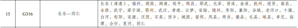 綏芬河—滿(mǎn)洲里、琿春—阿爾山、集安—阿巴嘎旗、丹東—霍林郭勒、莊河—西烏珠穆沁旗、綏中—珠恩嘎達(dá)布其、黃驊—山丹、文登—石家莊、青島—蘭州、連云港—共和、連云港—欒川、上海—霍爾果斯、烏魯木齊—紅其拉甫、西寧—吐?tīng)栨靥?、長(zhǎng)樂(lè)—同仁、成都—噶爾、上海—聶拉木、高雄—成都、上海—瑞麗、廣州—成都、瑞安—友誼關(guān)、瑞金—清水河、福州—昆明、廣州—南寧、秀山—河口、連云港—固原、啟東—老河口、舟山—魯山、洞頭—合肥、丹東—阿勒泰、蘿北—額布都格、三合—莫力達(dá)瓦旗、龍井—東烏珠穆沁旗、承德—塔城、天津—神木、黃驊—榆林、海興—天峻、濱州港—榆林、東營(yíng)港—子長(zhǎng)、黃島—海晏、日照—鳳縣、大豐—盧氏、東臺(tái)—靈武、啟東—那曲、上海—安康、南京—德令哈、武漢—大理、芒康—薩嘎、利川—爐霍、臺(tái)州—小金、張家界—巧家、寧德—貢山、南昌—興義、福州—巴馬、湄洲—西昌、東山—瀘水、石獅—水口、佛山—富寧、文昌—臨高、陵水—昌江。