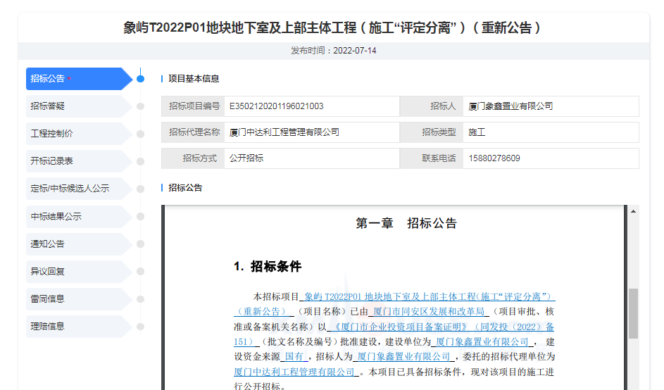 近日,象嶼T2022P01地塊地下室及上部主體工程(施工“評定分離”)(重新公告)招標(biāo)公告發(fā)布。