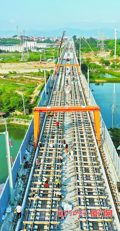 福廈高鐵廈門(mén)段無(wú)砟軌道鋪設(shè)施工現(xiàn)場(chǎng)。(廈門(mén)日?qǐng)?bào)記者 王協(xié)云 航拍器攝)