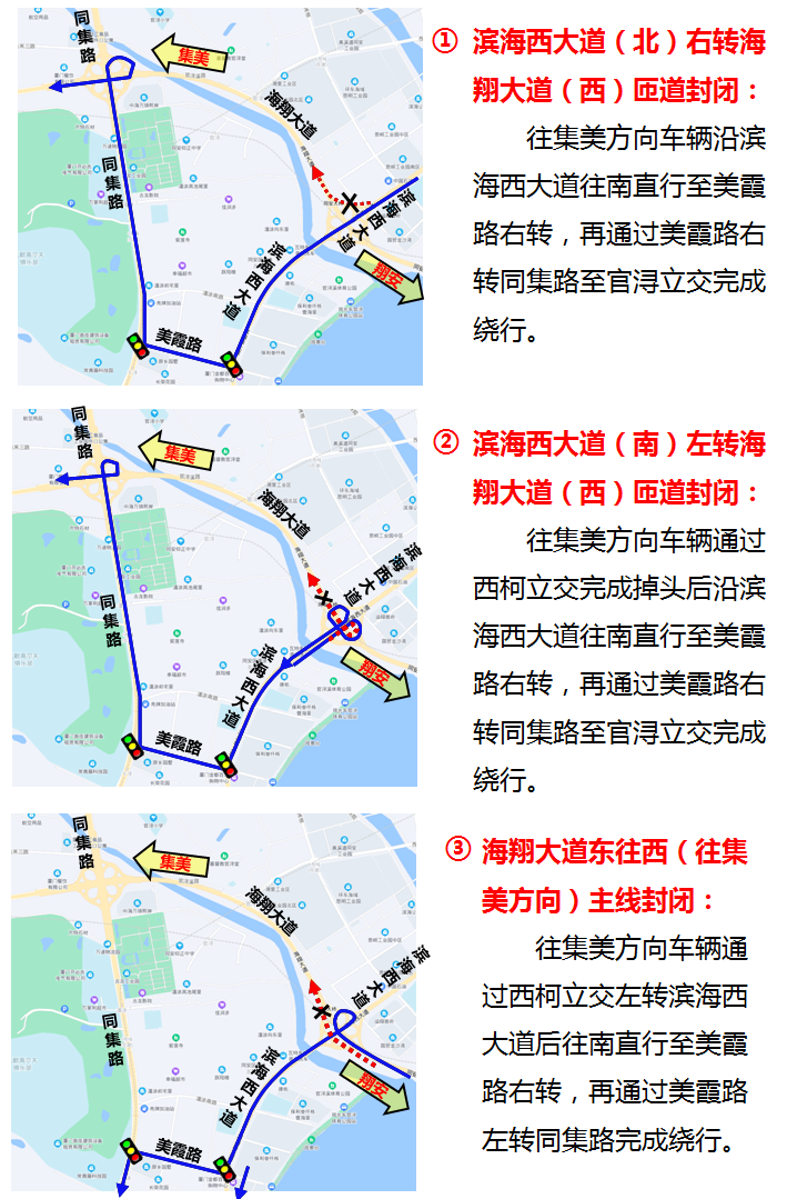2022年7月23日0時至11月10日24時,海翔大道官潯立交(同集路口)至西柯立交(濱海西大道路口)段機動車實行由西往東單向行駛(由海滄往翔安方向),禁止機動車由東往西(由翔安往海滄方向)通行,上述立交范圍內(nèi)相關(guān)匝道同步封閉。