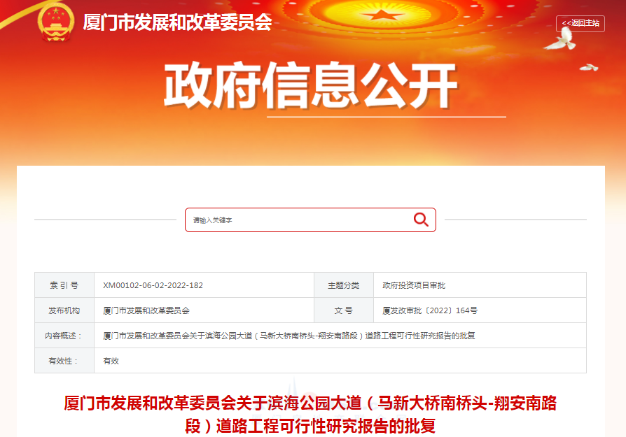 近日,廈門市發(fā)展和改革委員會發(fā)布關于濱海公園大道(馬新大橋南橋頭-翔安南路段)道路工程可行性研究報告的批復,同意建設濱海公園大道(馬新大橋南橋頭-翔安南路段)道路工程。