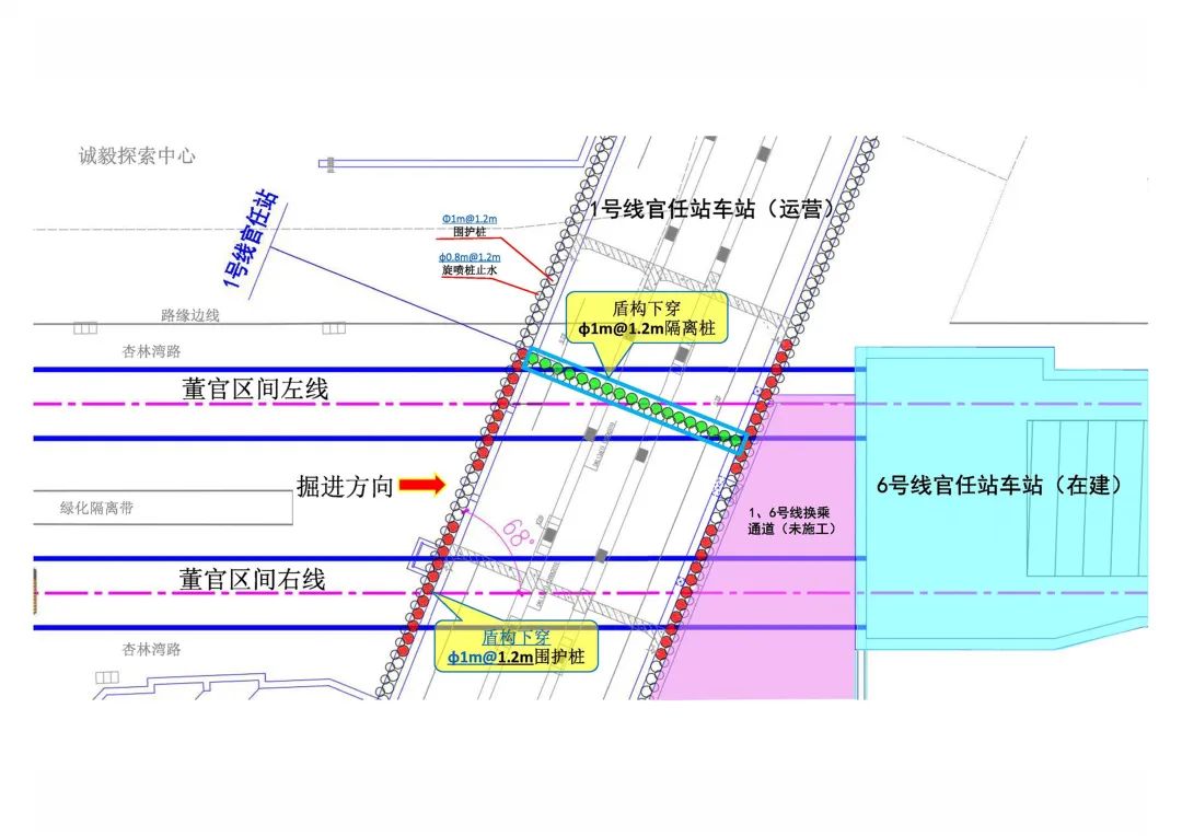 其中,盾構(gòu)下穿1號(hào)線官任站時(shí)要穿越車站既有樁基32根,穿越期間距車站主體結(jié)構(gòu)最小的凈距只有0.75米,對(duì)結(jié)構(gòu)沉降和盾構(gòu)機(jī)姿態(tài)控制,提出了極為嚴(yán)格的要求。
