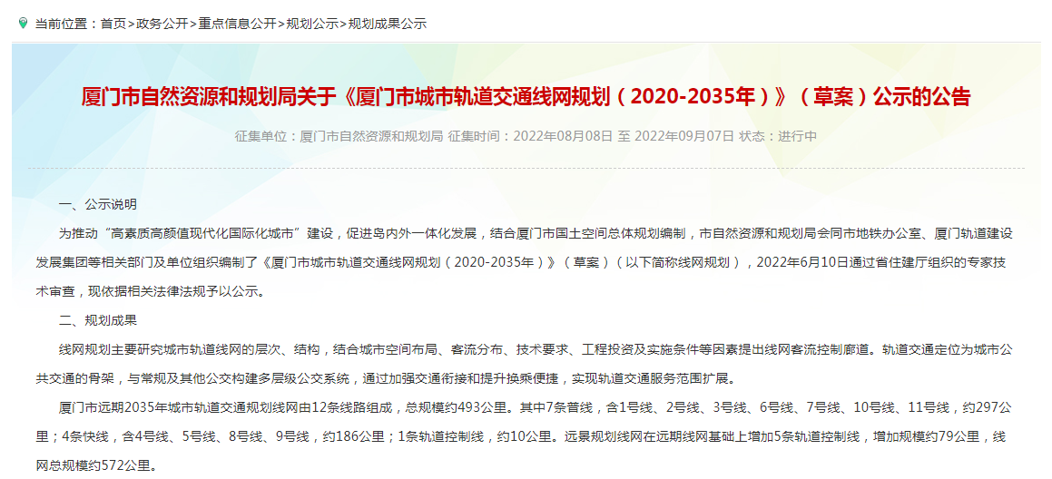 剛剛,廈門市自然資源和規(guī)劃局發(fā)布關(guān)于《廈門市城市軌道交通線網(wǎng)規(guī)劃(2020-2035年)》(草案)公示的公告。