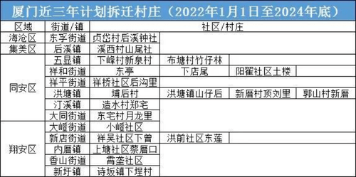 另,根據(jù)市自然規(guī)劃局近一個月的官方回復(fù),廈門近三年計劃拆遷和中遠(yuǎn)期計劃拆遷的村莊如下: