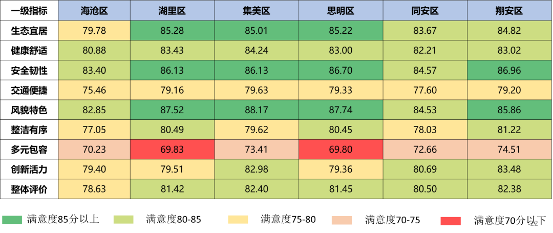 其中,集美區(qū)居民滿意度最高(82.40分),海滄區(qū)居民滿意度則相對偏低(78.63分)。