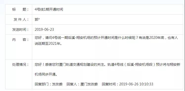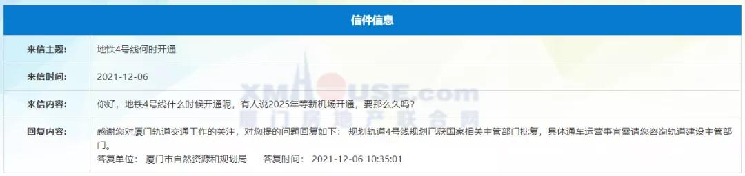 對(duì)此,廈門(mén)市自然資源和規(guī)劃局給出回復(fù):規(guī)劃軌道4號(hào)線規(guī)劃已獲國(guó)家相關(guān)主管部門(mén)批復(fù),具體通車(chē)運(yùn)營(yíng)事宜需請(qǐng)您咨詢軌道建設(shè)主管部門(mén)。