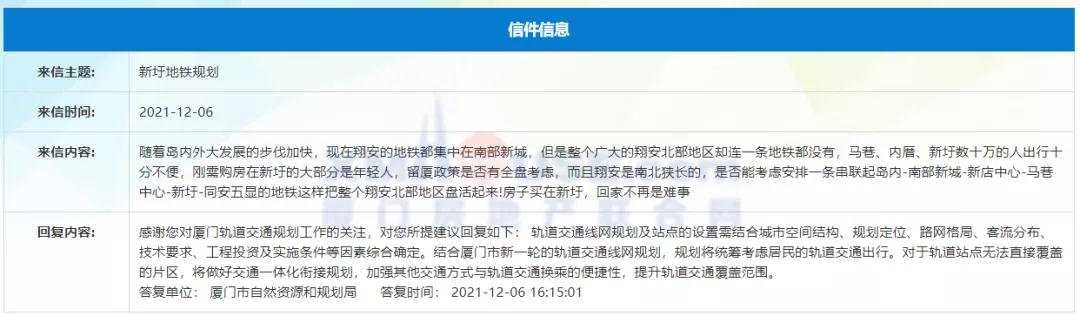 網(wǎng)友:希望安排一條地鐵,盤(pán)活翔安北部!