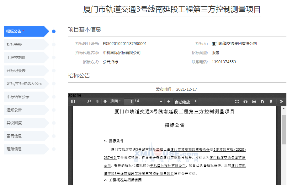 剛剛,廈門市公共資源交易網(wǎng)發(fā)布廈門市軌道交通3號(hào)線南延段工程第三方控制測(cè)量項(xiàng)目招標(biāo)公告。