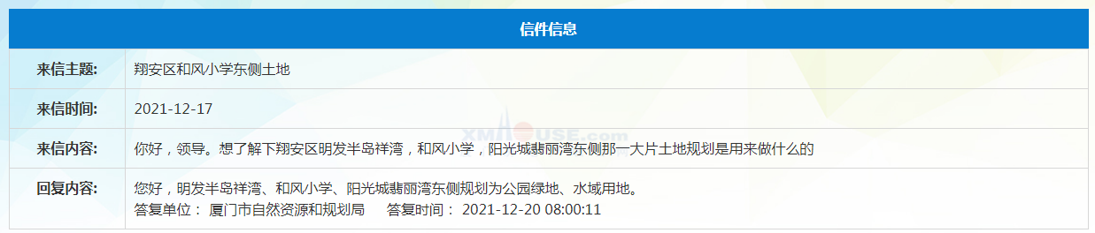 對(duì)此,廈門(mén)市自然資源和規(guī)劃局回復(fù):明發(fā)半島祥灣、和風(fēng)小學(xué)、陽(yáng)光城翡麗灣東側(cè)規(guī)劃為公園綠地、水域用地。