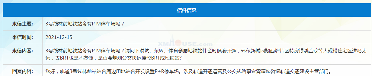 網(wǎng)友:3號(hào)線林前地鐵站旁有P M停車場(chǎng)嗎?請(qǐng)問下洪坑、東界、體育會(huì)展地鐵站什么時(shí)候會(huì)開通;環(huán)東新城同翔西爐片區(qū)特房銀溪金茂等大規(guī)模住宅區(qū)進(jìn)島太遠(yuǎn),去BRT也是不方便,是否會(huì)規(guī)劃公交快運(yùn)接駁BRT或地鐵站?