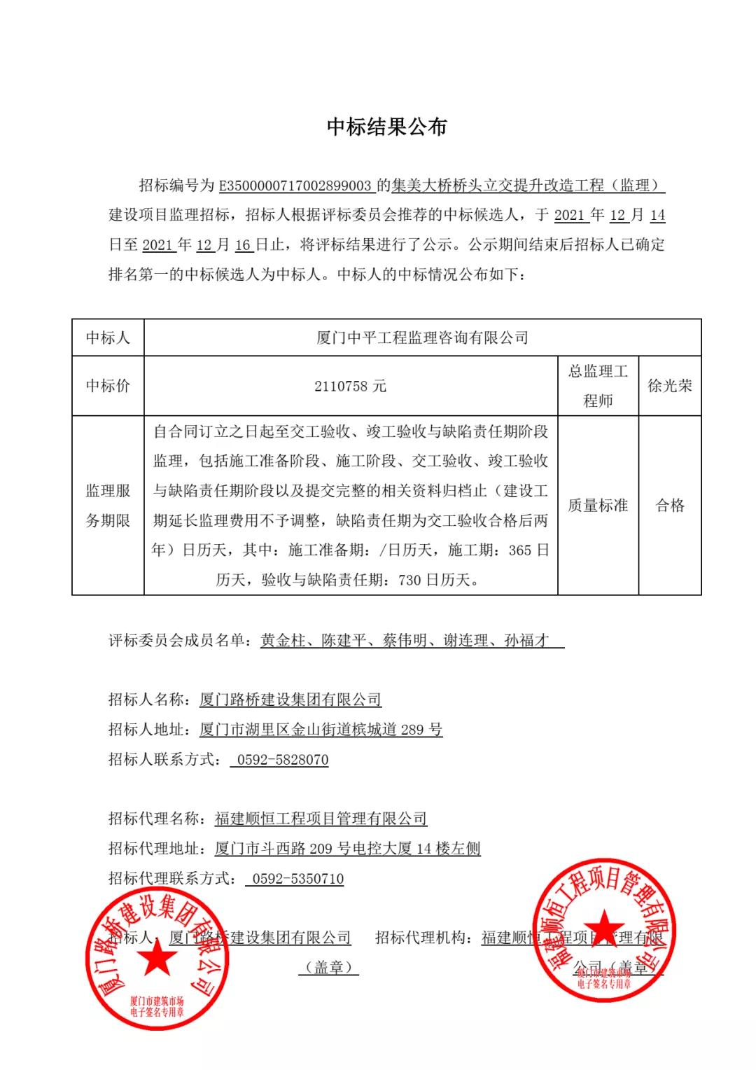 而今,該項(xiàng)目又有最新進(jìn)展傳來(lái):集美大橋橋頭立交提升改造工程中標(biāo)結(jié)果,中標(biāo)人為廈門中平工程監(jiān)理咨詢有限公司。
