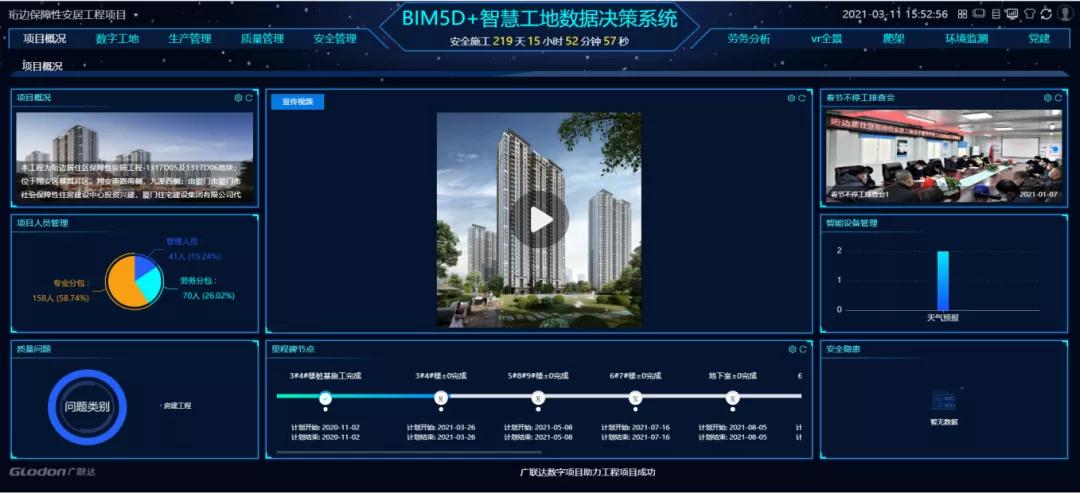 珩邊居住區(qū)保障性安居工程應(yīng)用了智慧工地?cái)?shù)據(jù)決策系統(tǒng),有效提升項(xiàng)目精細(xì)化管理水平,該系統(tǒng)結(jié)合BIM、大數(shù)據(jù)、AI等核心技術(shù),實(shí)時(shí)協(xié)同交互,實(shí)現(xiàn)建筑實(shí)體、生產(chǎn)要素、管理過程的全面數(shù)字化,強(qiáng)化了對(duì)項(xiàng)目人員、機(jī)械、物料、環(huán)境與能耗、進(jìn)度、質(zhì)量、安全等管理,為項(xiàng)目的快速推進(jìn)提供強(qiáng)力信息化技術(shù)支撐。