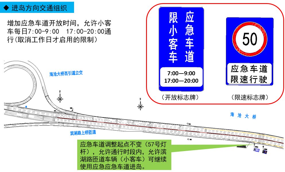 考慮海滄大橋非工作日交通流量的變化,決定增加應(yīng)急車道開放時間,取消非工作日禁止通行應(yīng)急車道的限制,允許每日7:00-9:00;17:00-20:00通行,開放區(qū)段、允許通行車型、限速不變。