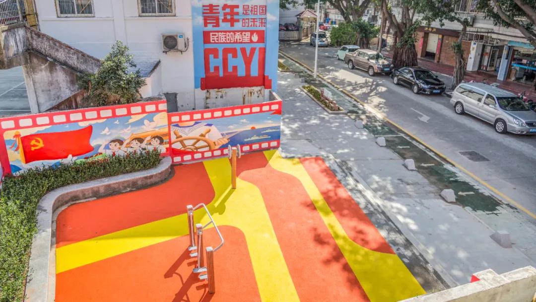 此處街心公園以共青團(tuán)元素為主題,總面積約300平方米。同時(shí),還與部隊(duì)文化交融,通過增設(shè)休憩廣場(chǎng)、健身器材,為居民提供足夠的休閑空間。