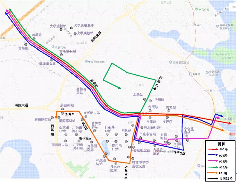 該線路行至杏前路海翔大道路口,改經(jīng)杏前路、杏林北路至杏林北路與杏林東路口,接原線路。904路減停明達(dá)、日新路口、杏林消防、廣興南路口、西濱路口、新源路口。925路減停明達(dá)、日新路口、杏林消防(往東輝山口)、碑頭(往園博苑)、宜興路口、新源路。