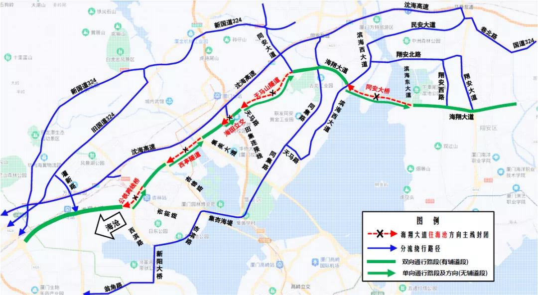 海翔大道西濱路立交至杏前路立交段、海翔大道杏錦路立交至集美大道立交段(含西亭隧道)和海翔大道天馬路口至同安大道立交段(含天馬山隧道)機(jī)動(dòng)車實(shí)行由西往東單向行駛(由海滄往翔安方向),禁止機(jī)動(dòng)車由東往西(由翔安往海滄方向)通行,上述立交范圍內(nèi)相關(guān)匝道同步封閉,受限機(jī)動(dòng)車請(qǐng)繞行沈海高速、濱海西大道、同集路和新324國(guó)道等周邊道路。