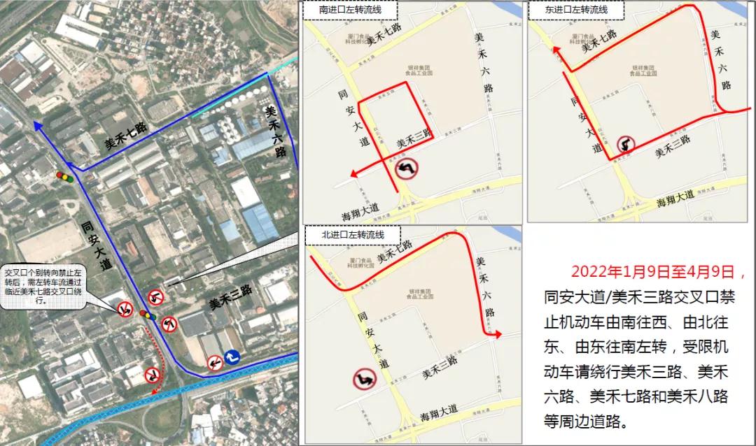 2022年1月9日至4月9日,同安大道/美禾三路交叉口禁止機(jī)動(dòng)車由南往西、由北往東、由東往南左轉(zhuǎn),受限機(jī)動(dòng)車請(qǐng)繞行美禾三路、美禾六路、美禾七路和美禾八路等周邊道路。