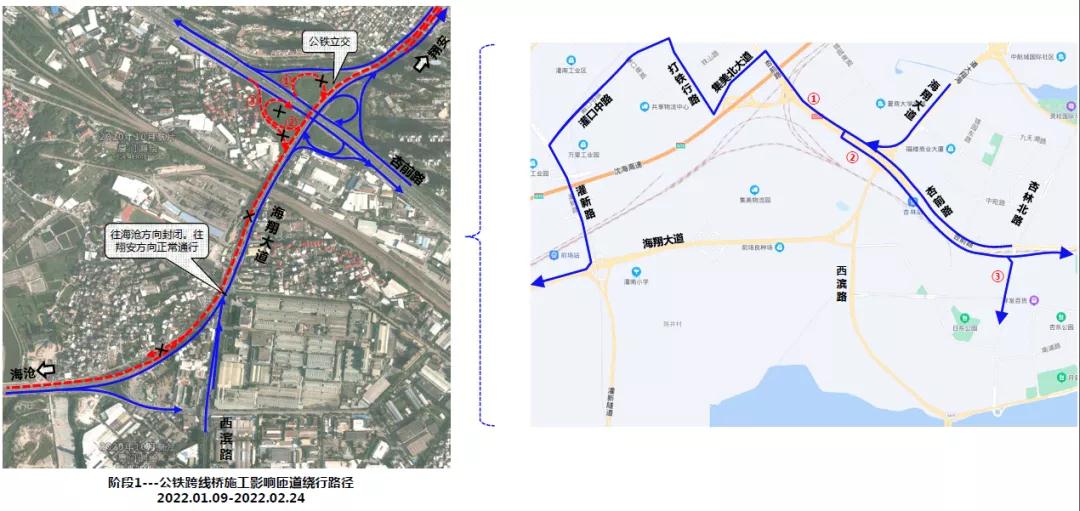 2022年1月9日至3月9日,海翔大道濱海西大道立交至濱海東大道立交(含同安大橋)機(jī)動(dòng)車實(shí)行由西往東單向行駛(由海滄往翔安方向),禁止機(jī)動(dòng)車由東往西(由翔安往海滄方向)通行,立交范圍內(nèi)相關(guān)匝道同步封閉,受限機(jī)動(dòng)車請(qǐng)繞行沈海高速、民安大道和翔安北路等周邊道路。
