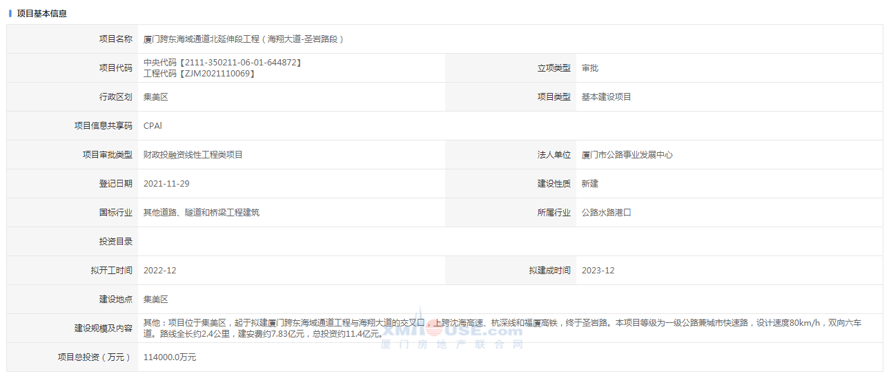 2021年11月底,廈門(mén)跨東海域通道北延伸段工程(海翔大道-圣巖路段)報(bào)建信息公布。
