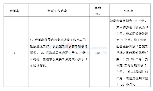 勘察監(jiān)理周期為92個(gè)月,其中初步設(shè)計(jì)階段為6個(gè)月,施工圖設(shè)計(jì)階段為9個(gè)月,施工現(xiàn)場(chǎng)配合服務(wù)階段(自施工招標(biāo)之日起至缺陷責(zé)任期止)為80個(gè)月(其中施工招標(biāo)期階段2個(gè)月,施工期階段54月,缺陷責(zé)任期階段為24個(gè)月)。
