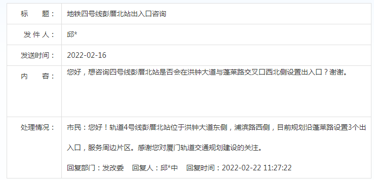 廈門市發(fā)改委回復(fù):軌道4號線彭厝北站位于洪鐘大道東側(cè),浦濱路西側(cè),目前規(guī)劃沿蓬萊路設(shè)置3個出入口,服務(wù)周邊片區(qū)。