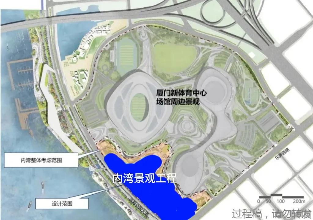 內(nèi)灣工程項(xiàng)目位于新體育中心西南角,濱海公園大道內(nèi)側(cè)設(shè)置內(nèi)湖水系,西臨濱海公園大道,外臨內(nèi)海,東南接?xùn)|界西路,東北與體育中心球迷廣場(chǎng)相接。整個(gè)項(xiàng)目可以定位為新體育中心環(huán)灣活力公園。