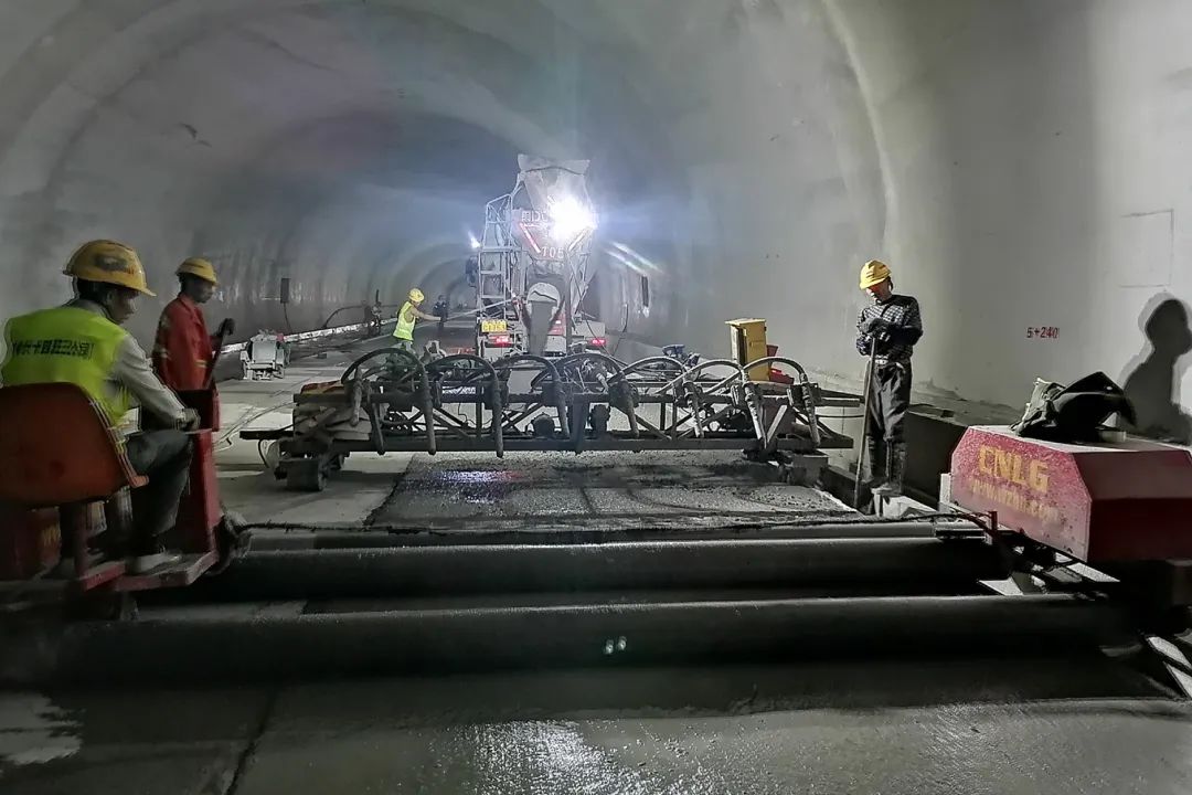 攪拌車(chē)、三滾軸、排式振搗器協(xié)同作業(yè),實(shí)現(xiàn)混凝土平整鋪設(shè) / 中鐵十四局供圖
