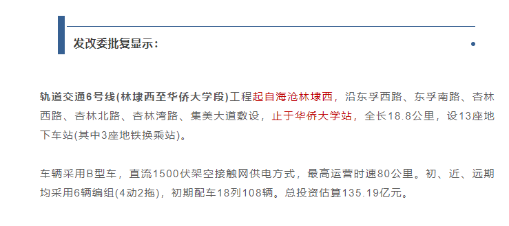就6號線(林埭西站至華僑大學站段)工程而言,根據(jù)之前市發(fā)改委發(fā)布關(guān)于軌道交通6號線(林埭西至華僑大學段)工程可行性研究報告的批復(fù)可知,工程2019年12月31日開工,計劃竣工日期,2023年8月31日??偼顿Y估算135.19億元。
