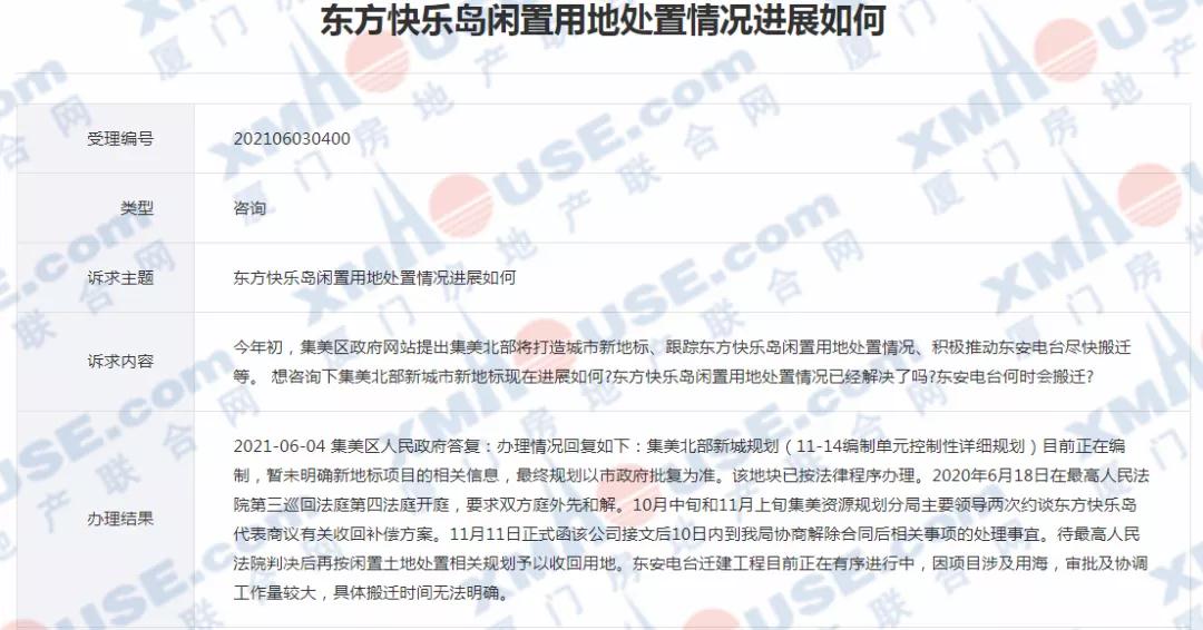 他提及,2021年初,集美區(qū)政府網(wǎng)站提出集美北部將打造城市新地標(biāo)、跟蹤東方快樂島閑置用地處置情況、積極推動?xùn)|安電臺盡快搬遷等。