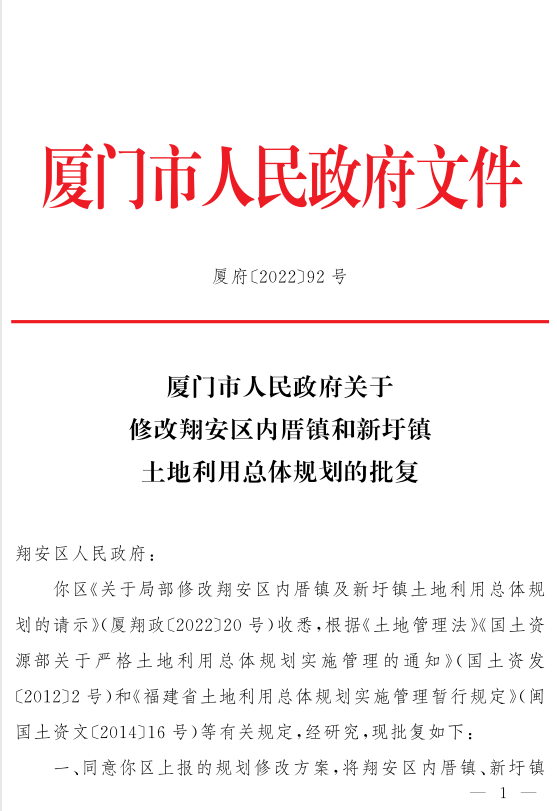 廈門市人民政府關(guān)于修改翔安區(qū)內(nèi)厝鎮(zhèn)和新圩鎮(zhèn)土地利用總體規(guī)劃的批復(fù)