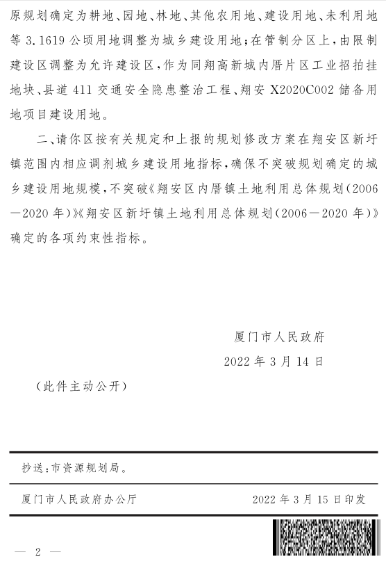 一、同意你區(qū)上報(bào)的規(guī)劃修改方案,將翔安區(qū)內(nèi)厝鎮(zhèn)、新圩鎮(zhèn)原規(guī)劃確定為耕地、園地、林地、其他農(nóng)用地、建設(shè)用地、未利用地等3.1619公頃用地調(diào)整為城鄉(xiāng)建設(shè)用地;在管制分區(qū)上,由限制建設(shè)區(qū)調(diào)整為允許建設(shè)區(qū),作為同翔高新城內(nèi)厝片區(qū)工業(yè)招拍掛地塊、縣道411交通安全隱患整治工程、翔安X2020C002儲(chǔ)備用地項(xiàng)目建設(shè)用地。