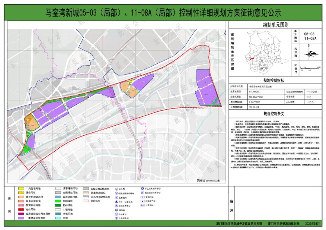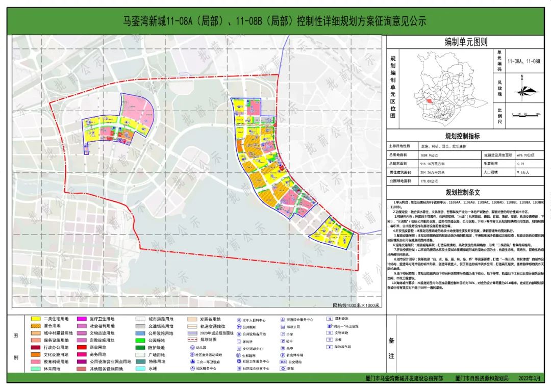 近日,廈門市自然資源和規(guī)劃委發(fā)布馬鑾灣新城11-08A(局部)、11-08B(局部)、05-03(局部)、11-08A(局部)控制性詳細規(guī)劃方案征詢意見公示。