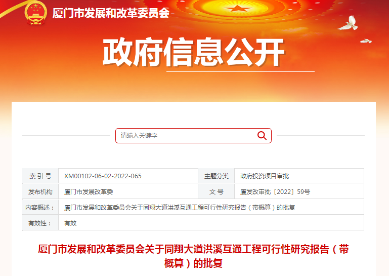 今天上午,廈門市發(fā)展和改革委員會(huì)發(fā)布關(guān)于同翔大道洪溪互通工程可行性研究報(bào)告(帶概算)的批復(fù),同意建設(shè)同翔大道洪溪互通工程。