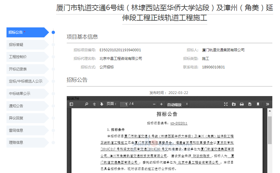 近日,廈門市軌道交通6號(hào)線(林埭西至華僑大學(xué)段)及漳州(角美)延伸段工程正線軌道工程施工招標(biāo)公告發(fā)布。