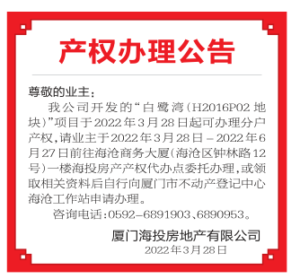 廈門海投房地產(chǎn)有限公司開發(fā)的“白鷺灣(H2016P02地塊)”項(xiàng)目于2022年3月28日起可辦理分戶產(chǎn)權(quán),請(qǐng)業(yè)主于2022年3月28日-2022年6月27日前往海滄商務(wù)大廈(海滄區(qū)鐘林路12號(hào))一樓海投房產(chǎn)產(chǎn)權(quán)代辦點(diǎn)委托辦理,或領(lǐng)取相關(guān)資料后自行向廈門市不動(dòng)產(chǎn)登記中心海滄工作站申請(qǐng)辦理。