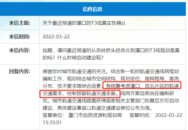 需要指出的是,雖然未批復(fù),但是從另外一則官方回復(fù)可知:有統(tǒng)籌考慮灌口、杏北片區(qū)的軌道交通需求,控制預(yù)留軌道交通走廊。