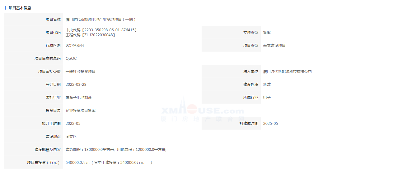 近日,廈門時(shí)代新能源電池產(chǎn)業(yè)基地項(xiàng)目(一期)報(bào)建信息公布。