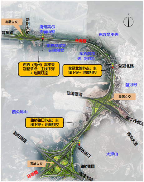 主要新建路橋路口、鰲冠北路及東方高爾夫別墅路口下穿通道,完善輔道及慢行系統(tǒng)等。